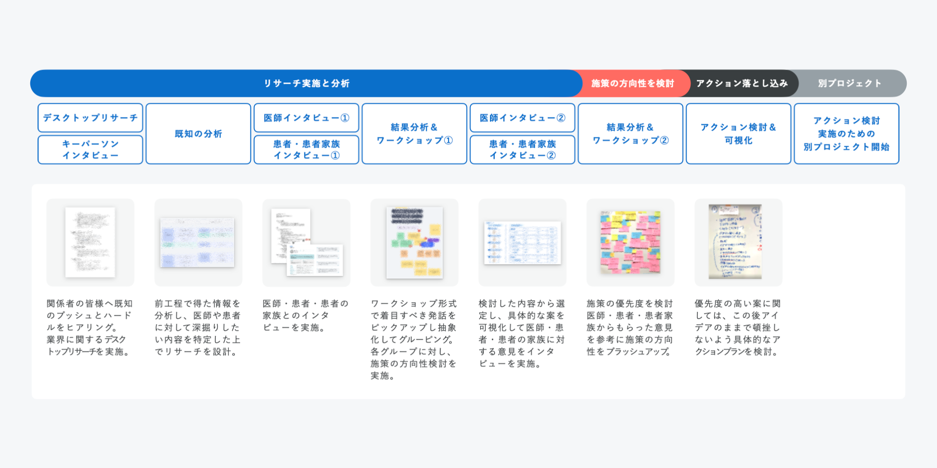 Insight Researchでは、リサーチの①目的設定と分析、②施策方向性検討、③アクションへの落とし込みまでグッドパッチのデザインリサーチャーが一貫してクライアントと並走する、探索型リサーチを実施します。