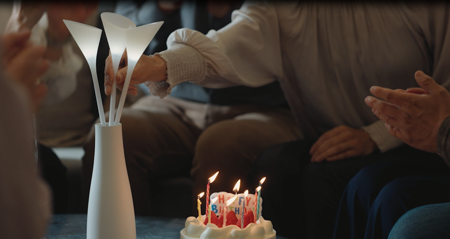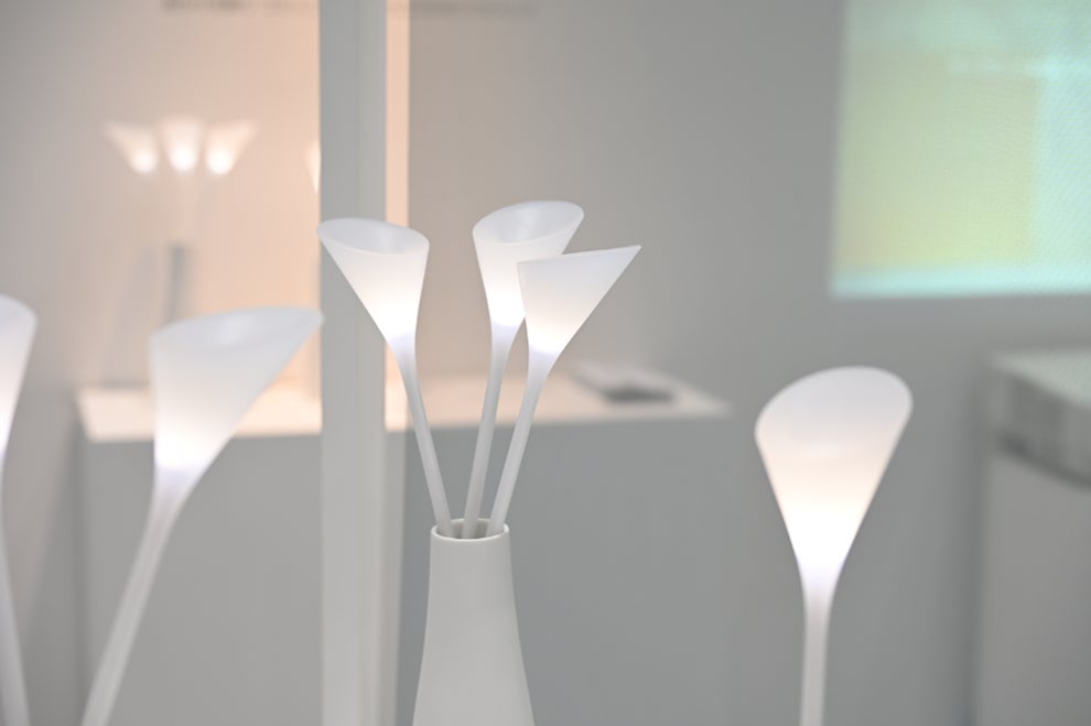 花型の照明を花瓶に挿すことで、ワイヤレス給電により電力が伝わり、あかりが灯ります。