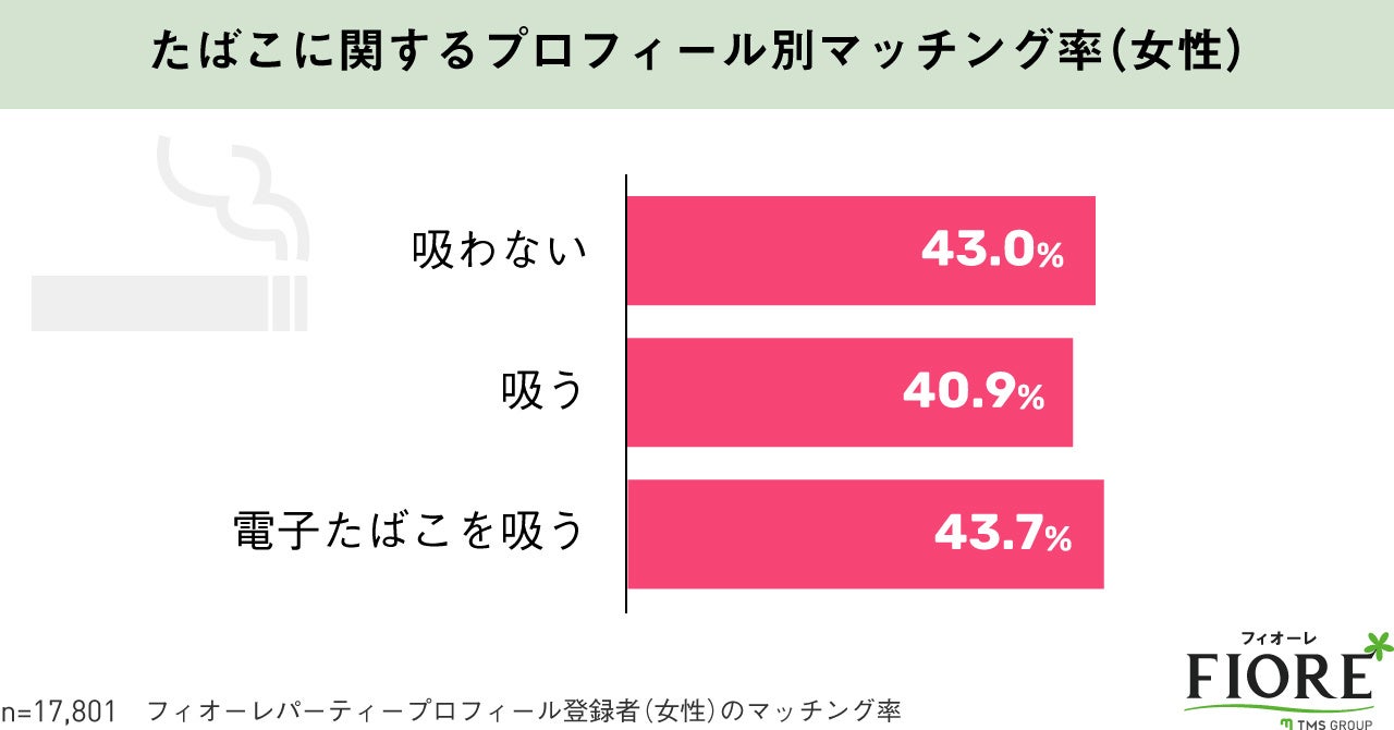 女性の場合、たばこに関するプロフィールによるマッチング率の大きな差異はなく、喫煙者でもマッチング率40%以上の結果となりました。