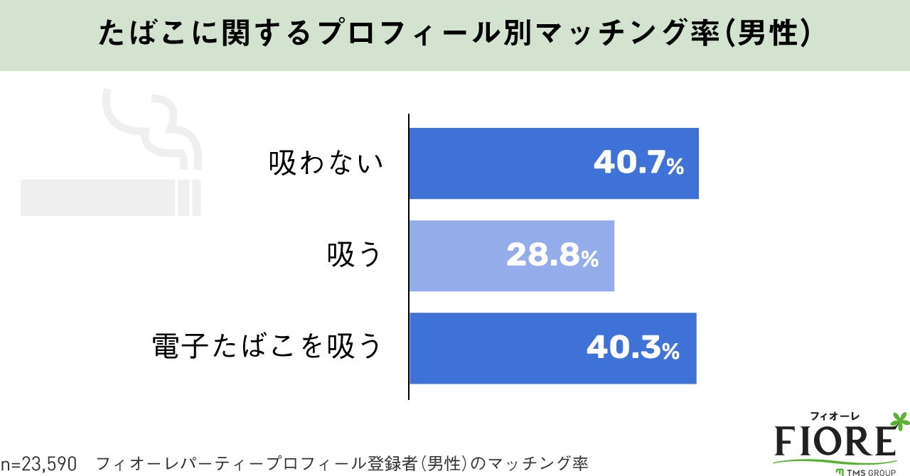 たばこを吸う男性のマッチング率は、たばこを吸わない男性と比較すると12%ほどマッチング率が下がるものの、電子たばこを吸う男性の場合、たばこを吸わない男性と同等のマッチング率になる結果となりました。