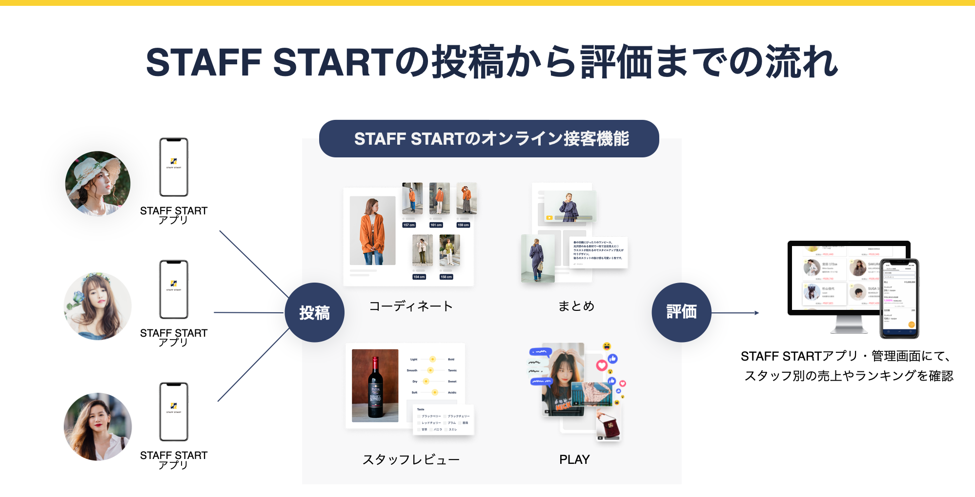 「STAFF START」は、専用アプリを通じて、自社ECサイトやSNSなどで、店舗スタッフのオンライン接客を可能にするStaff Techサービスです。スタッフ1人ひとりの投稿コンテンツを経由し、どのくらいEC売上やPVが発生したか成果が可視化されるので、本部はそれらの実績を店舗やスタッフ個人の評価に役立てることができます。