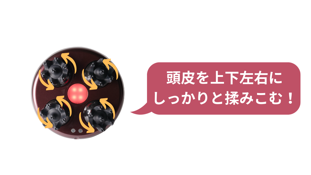 綿密に計算・設計されたローラーの動きはヘッドスパのハンドテクニックを再現。頭皮を上下左右の連続的な動きでしっかり揉みこみます。