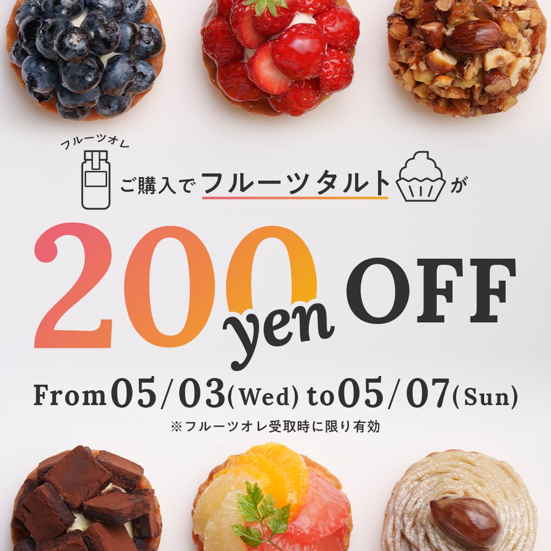 リニューアルオープン記念及びゴールデンウィークの特別キャンペーンとして、5/3(水)〜5/7(日)までの5日間、フルーツオレをご購入の方に、今回新しく取り扱いを開始するTARTE&LOVEのフルーツタルトを200円引きで販売いたします。この機会にぜひお試しください。