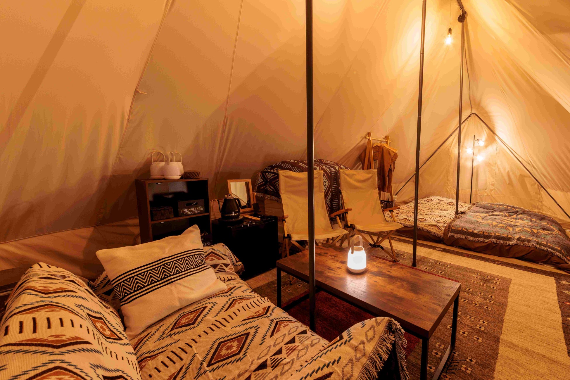 本格的なテントの中には、北欧風のテイストで揃えたソファーやアウトドアチェアー、寝具が揃っており、ゆったりとお過ごしいただけます。また、南京錠や金庫などもご用意しておりますので、外出時や就寝時のセキュリティ面も安心です。延長コードやUSBポートもあるので、スマホなどの充電も可能。冷暖房も完備しております。