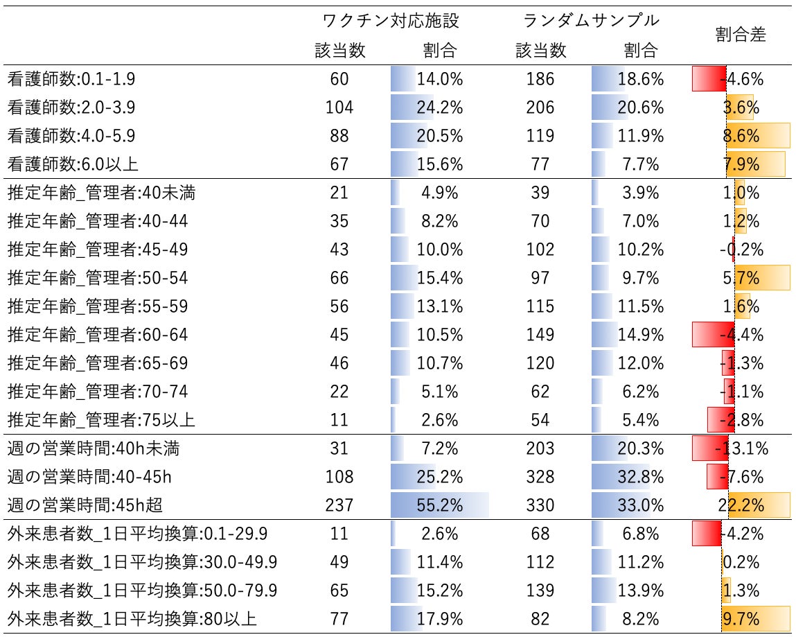 診療所の従事者や患者数について、ワクチン対応施設とランダムサンプリング施設を比較すると、ワクチン対応施設は看護師数が多い傾向が見られました。また、管理者(院長)の推定年齢は60歳未満であり、週の営業時間は45時間以上である傾向も見られました。1日平均外来患者数もランダムサンプリング施設より多く、診療規模が相対的に大きな診療所において、新型コロナウイルスワクチンの接種に対応している傾向が示唆されました。