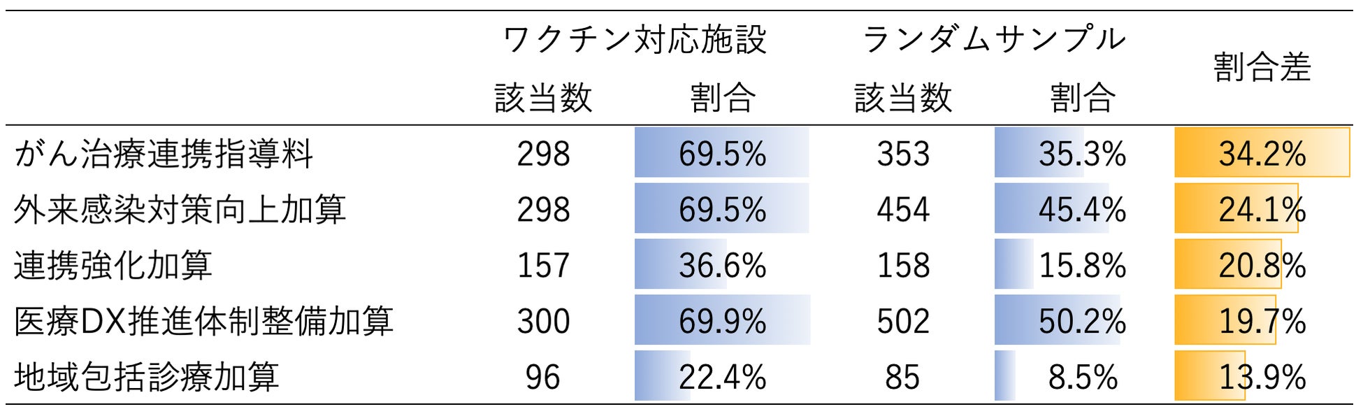施設基準については、ワクチン対応施設では「がん治療連携指導料」の届出割合が高く、がん診療に対応している診療所において新型コロナウイルスワクチンの接種が行われている傾向が示唆されました。同様に、ワクチン対応施設では「外来感染対策向上加算」、「連携強化加算」の届出割合が高く、感染症に対応する体制を整備している傾向が見られました。