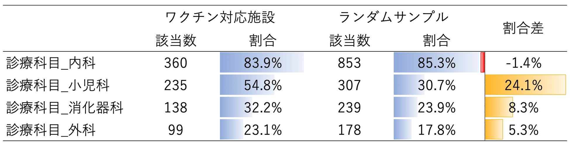 ワクチン対応施設で最も標榜が多かったのは「内科」でしたが、ランダムサンプリング施設と比較すると、「小児科」や「消化器科」「外科」を標榜する診療所の割合が相対的に高い傾向が見られました。