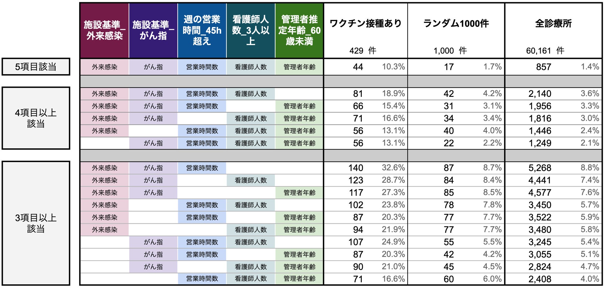 また、これらの特徴を基に全国の診療所を分析したところ、新型コロナウイルスワクチン接種に対応する可能性が高い診療所を特定することができました。5つの特徴的な属性をすべて持つ診療所は857施設、4つの属性を持つ診療所は4,322施設、3つの属性を持つ診療所は10,412施設存在することが分かりました。