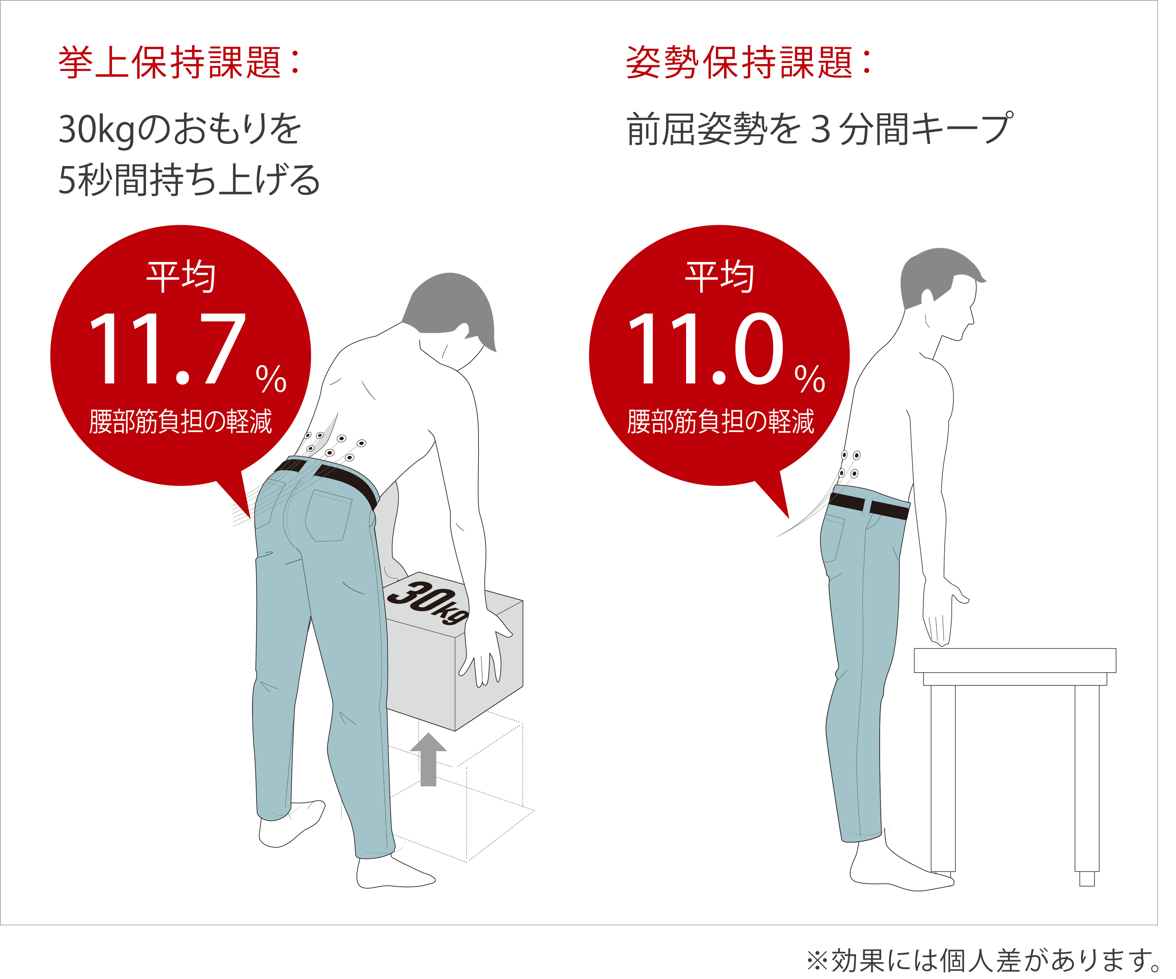 ・30kgウエイト挙上時:未装着比 -11.7%(平均)