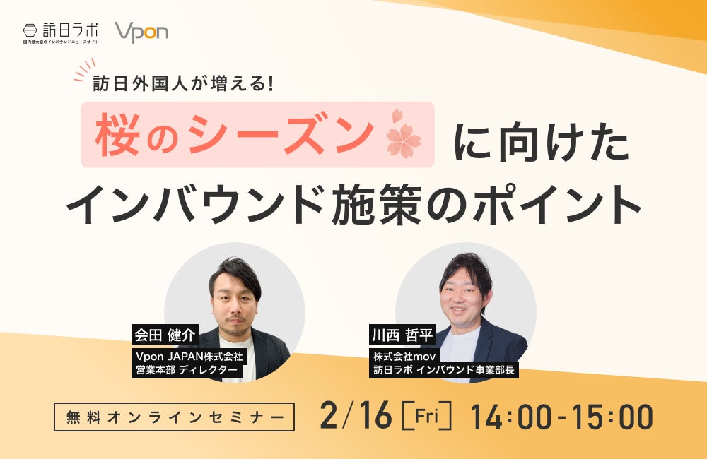日本の魅力をデータ&デジタルの力で世界へ届けるVpon JAPAN株式会社(代表取締役:篠原 好孝、本社:東京都新宿区、以下Vpon JAPAN)は、国内最大級のインバウンド総合メディア「訪日ラボ」を運営する株式会社mov(代表取締役:渡邊 誠、本社:東京都渋谷区、以下mov)と共催セミナーを開催いたします。