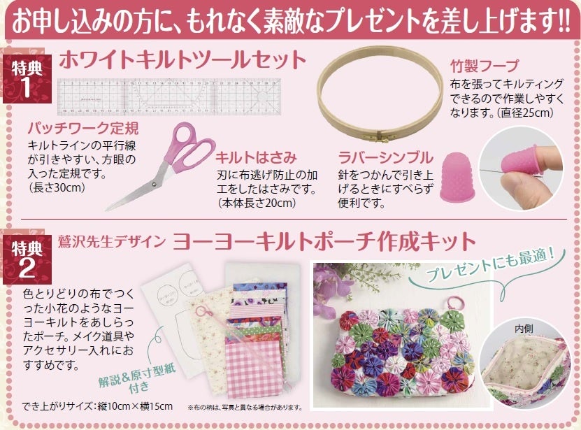 本キットは「キルトおぶはーと」の主催である、鷲沢玲子先生の監修で作られており、奥が深いキルト作りの世界へのファーストステップとしてぴったりです。また、鷲沢玲子先生のキルトギャラリーも本誌に付属しており、彼女の素晴らしい作品に触れることができます。