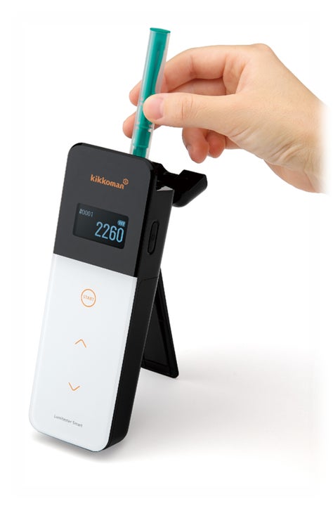 オプテックスとキッコーマンバイオケミファが共同開発したルミノメーター「ルミテスター Smart」は、飲食店の厨房や食品工場、医療現場などにおいて人の目では確認できない汚れを測定し数値化する「ATP検査」による衛生状態モニタリングシステムです。