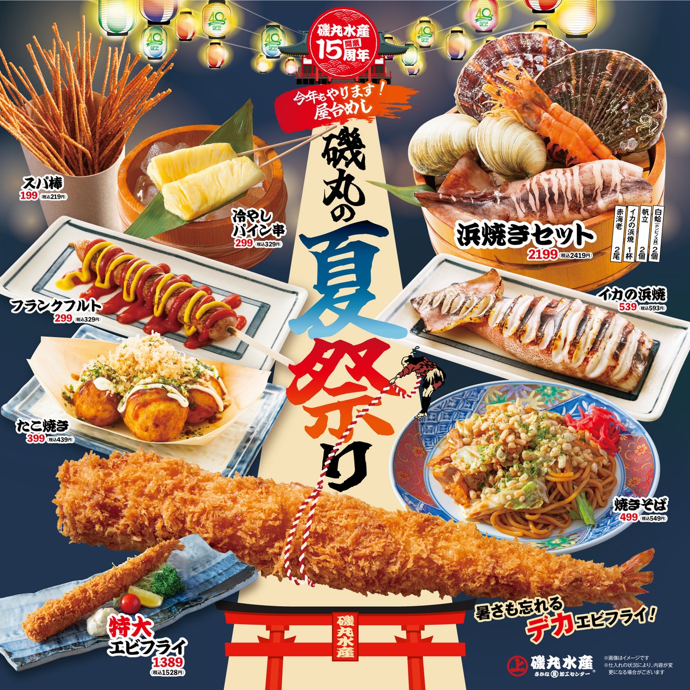 15周年記念の今年は、磯丸名物「夏祭り」と『ベビースター』コラボが同時開催!暑さを吹き飛ばせ! デカエビフライが登場♪