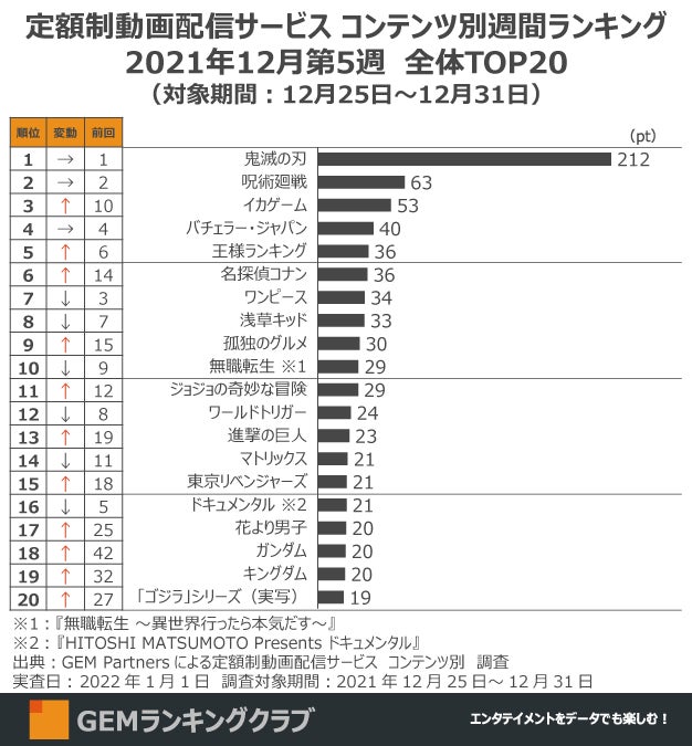 『鬼滅の刃』2021年最終週に圧倒的1位を飾る、『呪術廻戦』『イカゲーム』『バチェラー』が続く~定額制動画配信サービス コンテンツ別週間ランキングTOP20(2021年12月第5週)