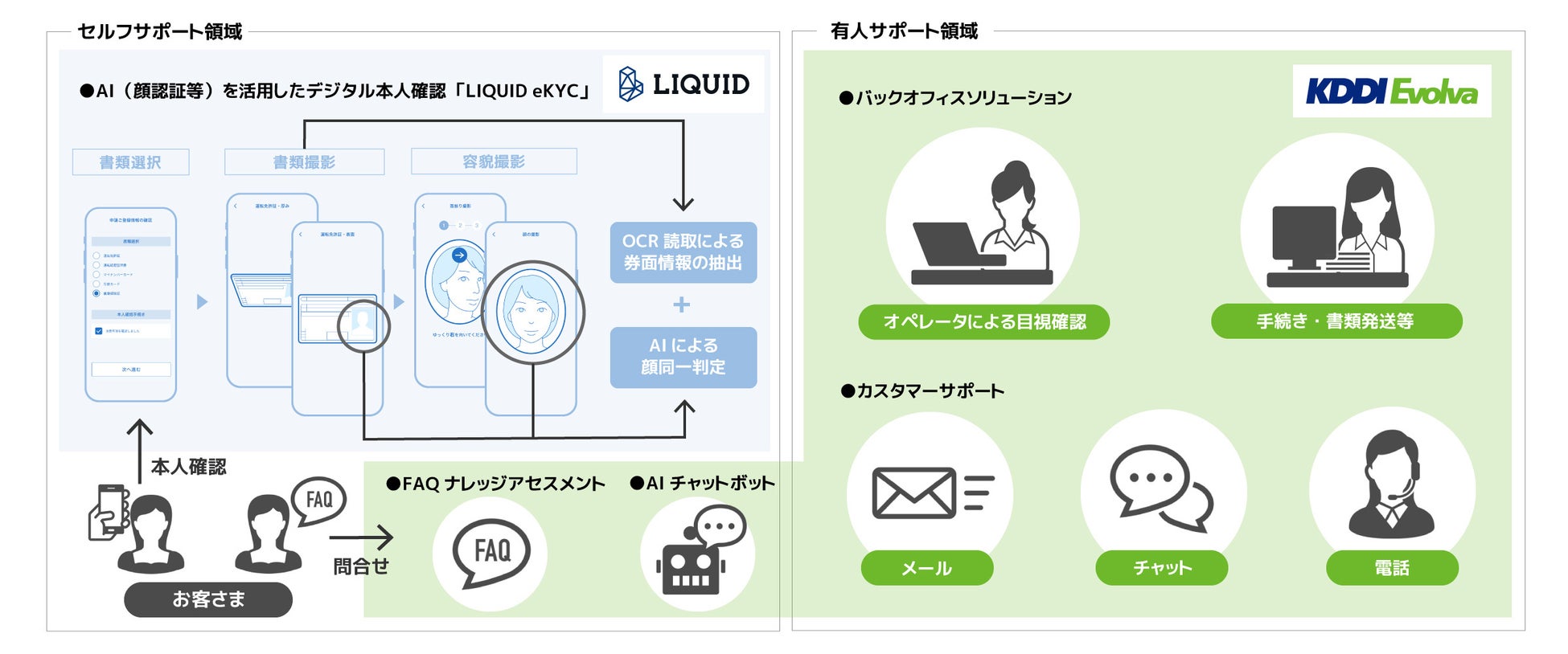 なお、KDDIエボルバでは、「LIQUID eKYC」導入に伴うお客さまからのお問合せ、本人確認後の事務処理にかかる対応に、デジタルチャネルと有人チャネル、バックオフィス業務のハイブリッド型カスタマーサポートを設計し、トータル運用している実績があります。
