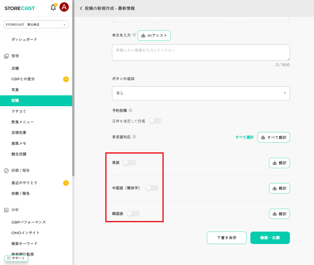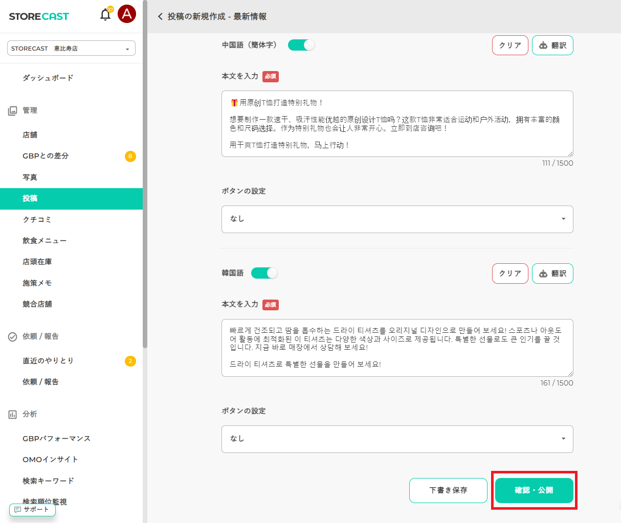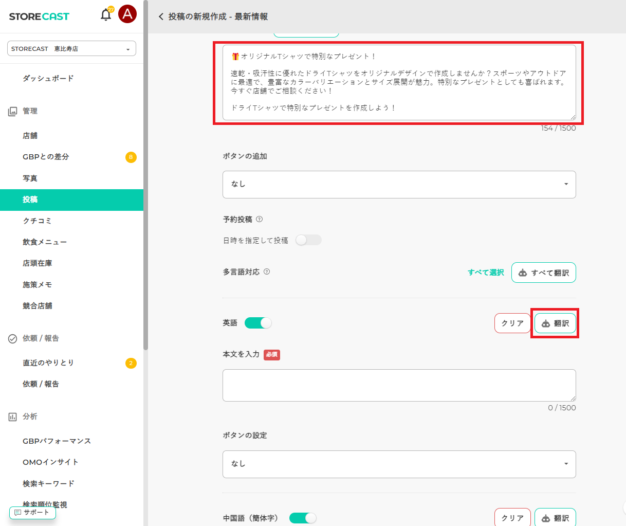 STORECAST内「投稿」において、日本語で入力した文章を英語、中国語(簡体字)、韓国語に翻訳し、投稿することができます。