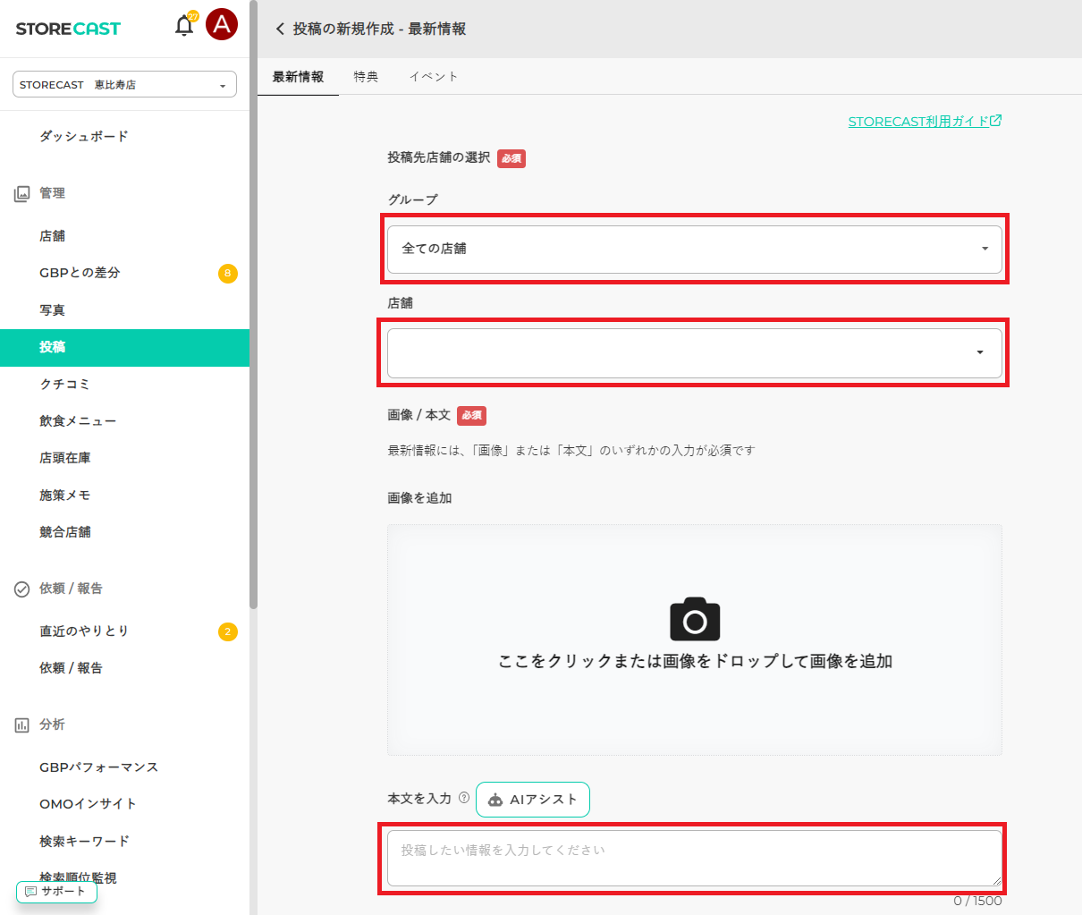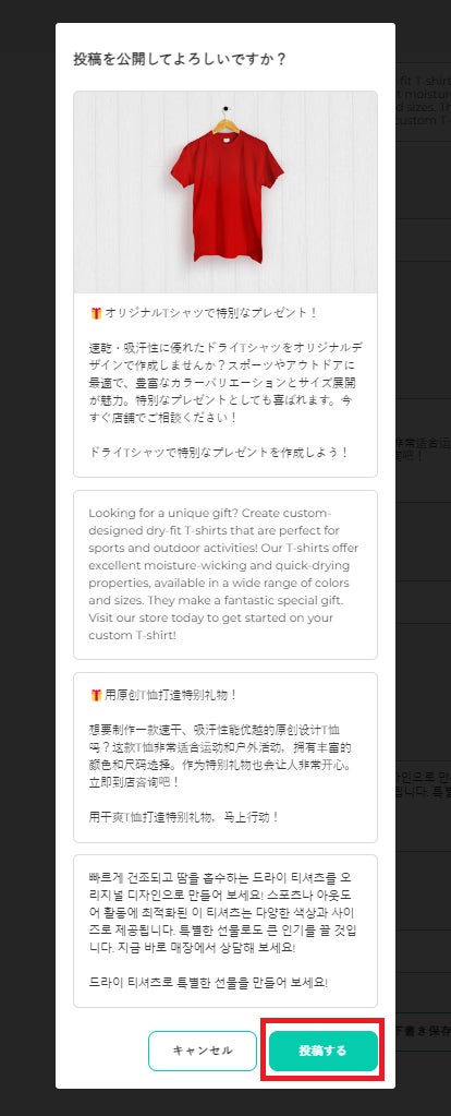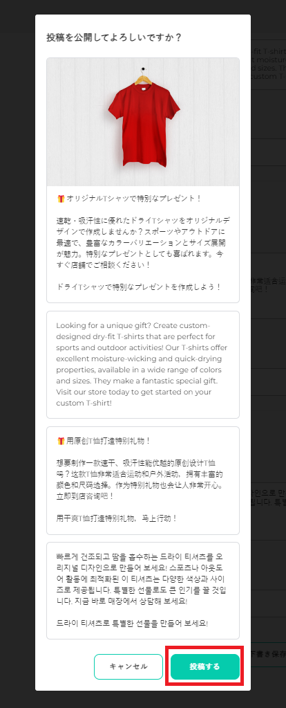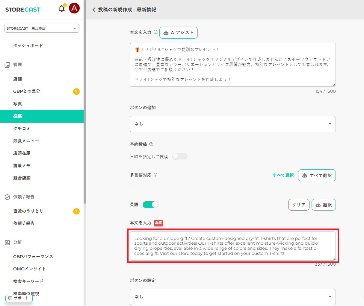 STORECAST内「投稿」において、日本語で入力した文章を英語、中国語(簡体字)、韓国語に翻訳し、投稿することができます。