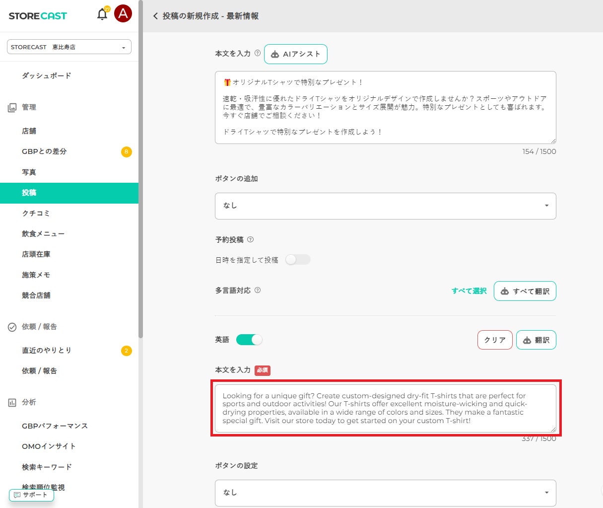 このたび、店舗運営者の皆様からご要望の多かったインバウンド対応として、Googleビジネス プロフィールに掲載する投稿文の多言語翻訳機能を「STORECAST」でリリースしました。