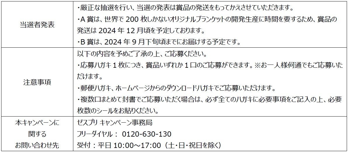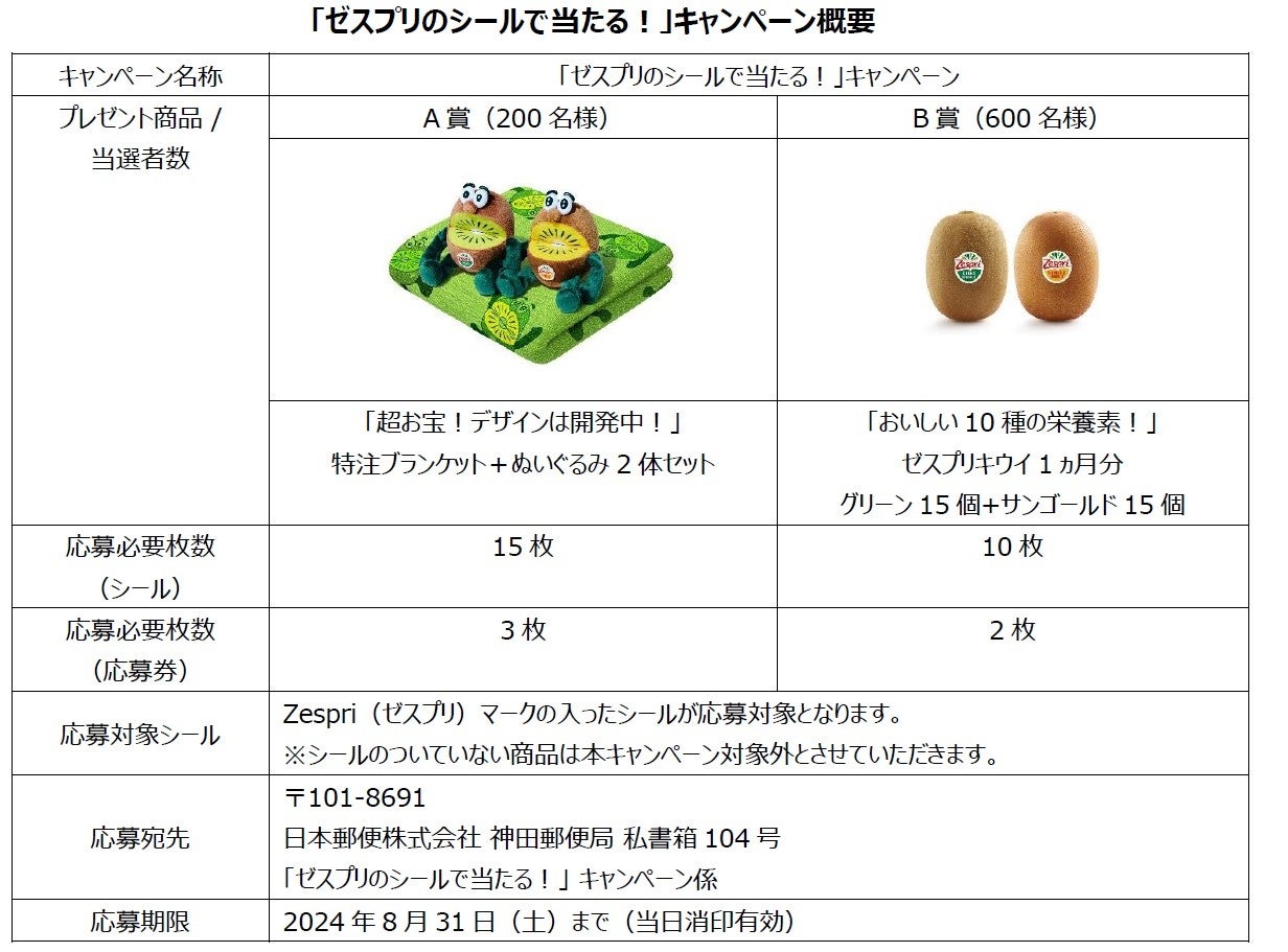 賞品は全部で2種類。A賞はシール15枚で「超お宝!デザインは開発中!」特注ブランケット+ぬいぐるみ2体セット、B賞はシール10枚で「おいしい10種の栄養素!」ゼスプリキウイ1ヵ月分(グリーン15個+サンゴールド15個)です。