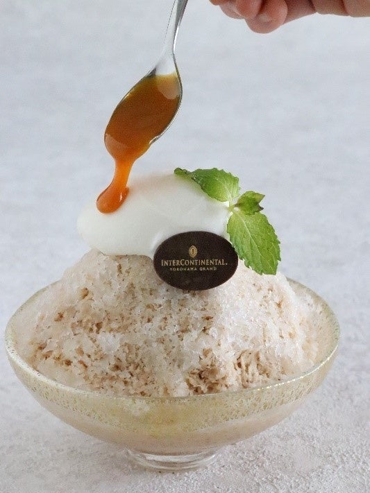 「ロイヤルミルクティー」は、キャラメルフレーバーの紅茶にフレッシュクリームやミルクなどをたっぷりと使った、マリンブルーで人気のロイヤルミルクティーで作った氷を削ってフワフワのかき氷に仕上げました。中にはホテル自家製のバニラアイスクリームが入っています。紅茶の豊かな香りの中にキャラメルのほろ苦さを感じるかき氷は、まろやかで口当たりのよいクレームシャンティと合わせることでより濃厚でリッチな味わいが楽しめる、紅茶好きの方にぜひ味わっていただきたい一品です。
