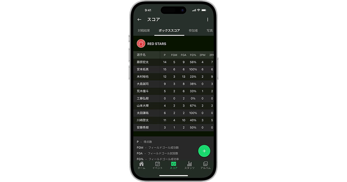 チーム全体のスタッツに加え、該当する試合の個人スタッツも入力したスコアから自動で算出されます。