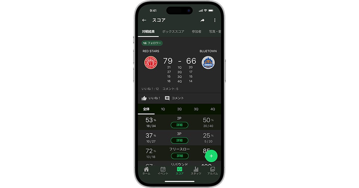 “Play-by-Play”で入力したスコアから、チーム全体の「2Pシュート成功率」「3Pシュート成功率」などが自動で集計されます。試合全体はもちろん、クオーターごとにチームのシュート成功率やリバウンド数などのスタッツを一目で振り返ることができます。