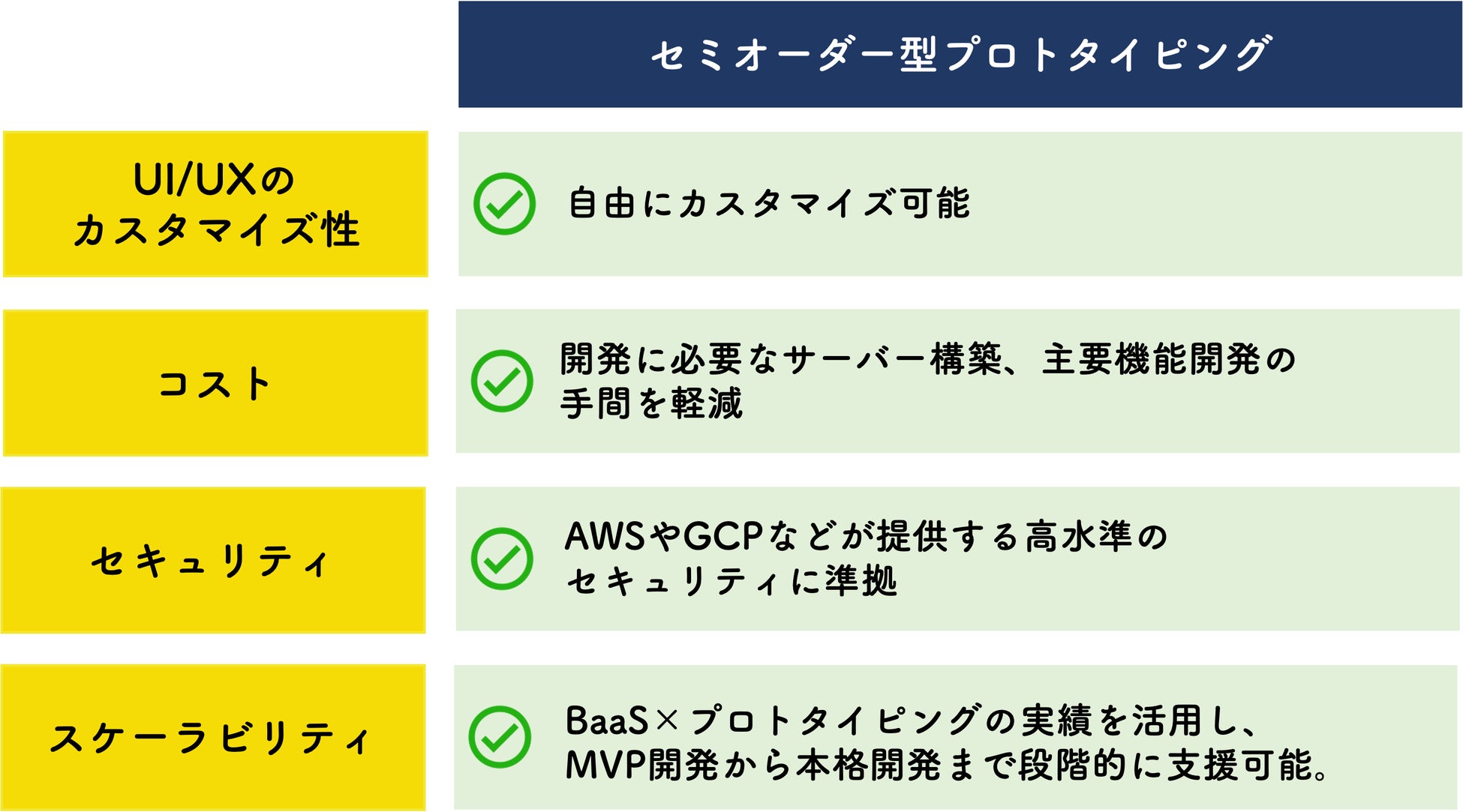 前述の課題に対して、インフラ構築/バックエンド領域を自動化するBaaSを活用した、「セミオーダー型プロトタイピング」の提供を開始しました。BaaSの導入により、プロダクト開発に必要なサーバー構築、機能開発の負担を大幅に削減し、開発リソースをUI/UXに集中させることで、カスタマイズ性の高いプロダクトを短期間で実現することが可能になります。