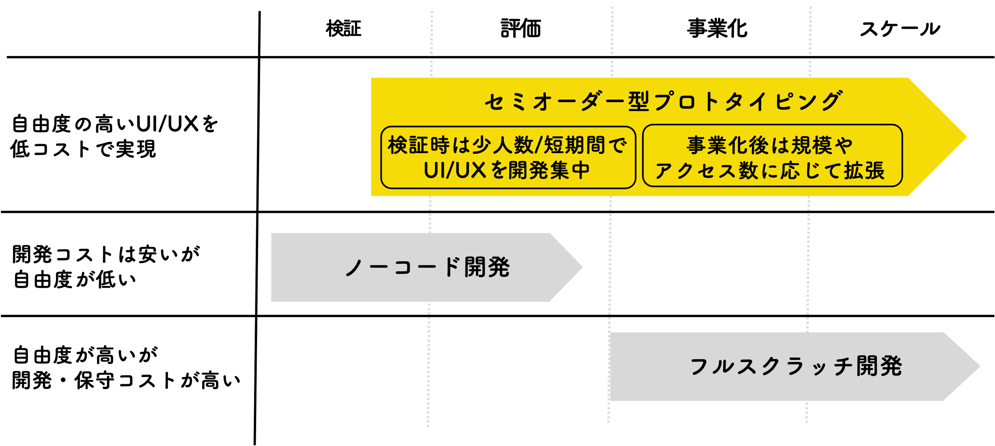 不確実性の高い新規事業開発においては、初期フェーズから多大な時間やコストを投下してプロダクトを本格的に開発するのではなく、プロトタイプの制作〜検証・改善を繰り返すプロセスの重要性が高まってきています。プロダクトが提供する解決策の有効性を検証するためには、魅力的なユーザー体験(UX)を生み出すための独自機能やUI設計が重要になりますが、ゼロからすべてを構築するフルスクラッチ開発の場合、膨大な開発期間と人員・コストが必要となる可能性があります。