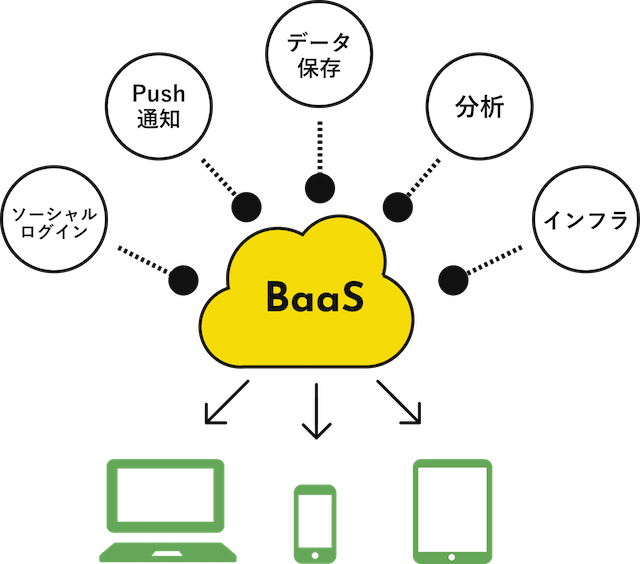 プロダクト開発で必要とされる共通のアプリケーション/インフラ構築をアウトソーシングするクラウドサービス。ユーザー認証、データベース管理、リモート更新、プッシュ通知、クラウドストレージ、ホスティングなど、サービス上で行われる一般的な機能を事前に提供しています。