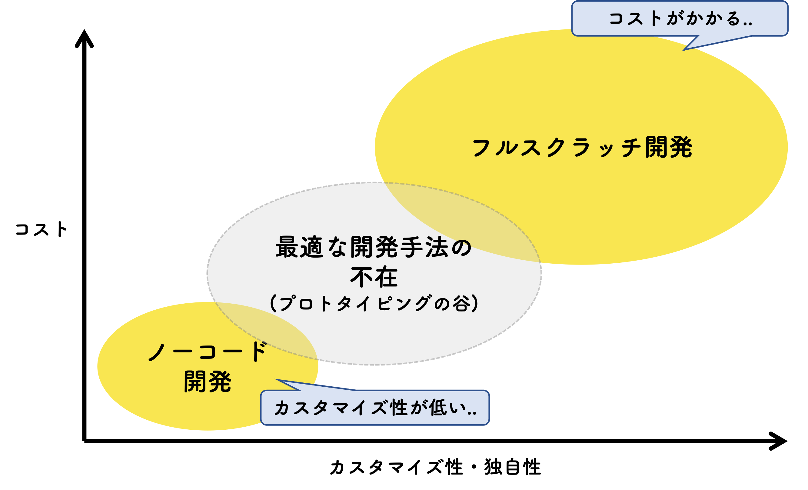 一方で、このような背景から近年広く普及してきているノーコードツールやローコードツールを活用する場合、ツールから提供される機能範囲内の実装に留まってしまうため、プロトタイプの要件を満たすほどのカスタマイズを実現できない可能性があり、実際の事業開発の現場における仮説検証活動が十分に行えていないことが多いのが実情です。