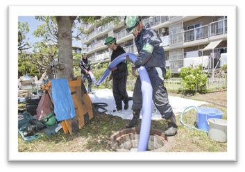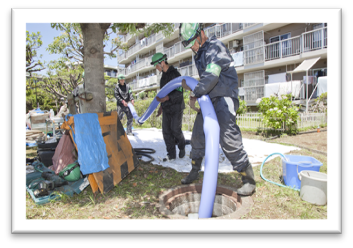 「リノベライナー工法」は、埋設された排水管の更生に最適な工法です。形状記憶型の硬質塩ビ管が、高熱の蒸気で円筒状に戻り、管内部にピッタリ密着。新しく高品質・高耐久な管を形成します。更生管の内径は塩化ビニル樹脂の肉厚分だけ縮小しますが、塩化ビニル樹脂は平滑性が高いため流下性能は低下しません。リノベライナー工法は、地面を掘り返さない非開削工法なので、施工がスピーディーで工期短縮とコストの削減が図れます。