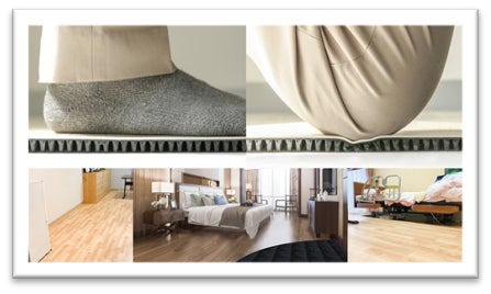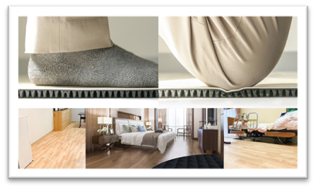 「ころやわ︎®︎」は転倒による骨折や頭部外傷リスクを低減するために必要な「衝撃吸収性」と、リハビリや移動時にはしっかりと歩ける「歩行安定性」の両立を実現した、転んだ時だけ衝撃を吸収する新しい床材です。 床材でありながら、椅子やベッドからの転落、車椅子への移乗時や歩行からの転倒時には大きく床が沈み込み、衝撃を吸収。「転ばせないための対策」から「転んでも骨折や外傷リスクを低減する環境づくり」を実現。