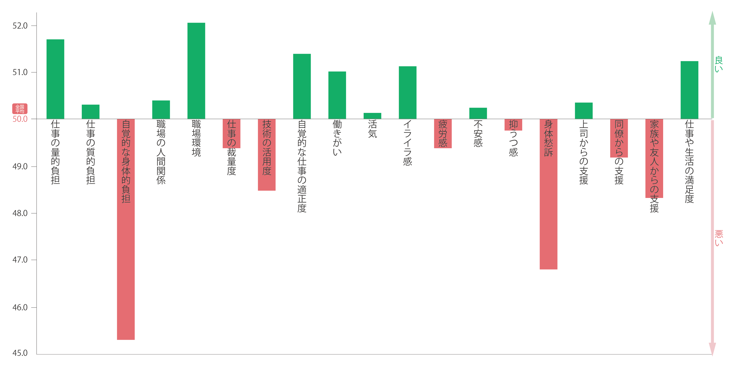 ストレスの傾向を「ストレス尺度」から見ていくと、業界に関係なく全体的に、【技能の活用度】【身体愁訴】【家族や友人からの支援度】の数値が不良であることがわかりました。これは昨年に引き続いての傾向です。