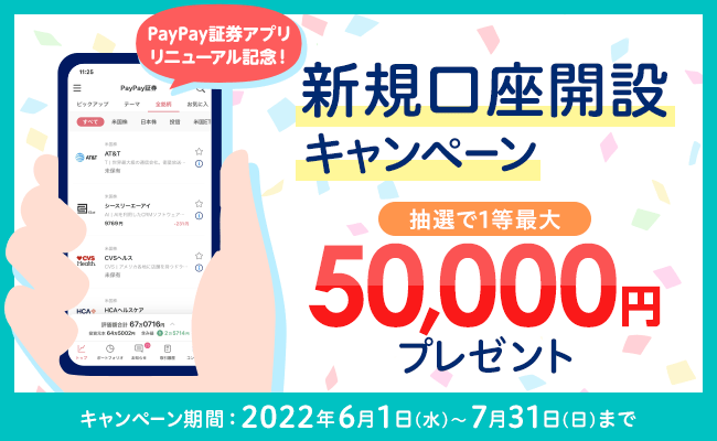 「資産運用を、より身近に。」をミッションに運営するスマホ証券 PayPay証券株式会社(東京都千代田区、代表取締役:内山 昌秋、以下「PayPay証券」)は、2022年6月1日(水)から、新規口座開設されたお客さまの中から抽選で10人に50,000円、1,000名に3,000円をプレゼントするキャンペーンを実施します。