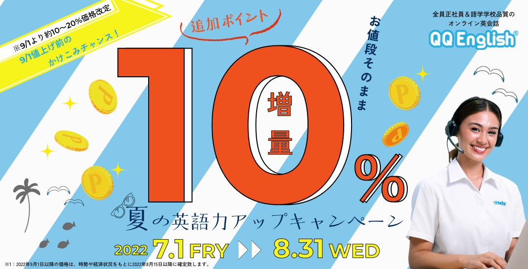 株式会社QQ English (本社:東京都新宿区、代表取締役:藤岡 頼光)は、提供するオンライン英会話サービス「QQ English」「QQキッズ」にて、追加ポイント10%増量キャンペーンを実施することをお知らせいたします。