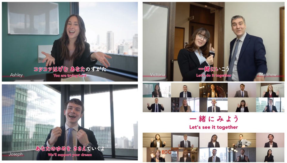 ECC60周年記念特設サイトでは、ECC外語学院の外国人講師20名が出演する新しい動画「講師動画シリーズ 『世界はかがやく』篇」を公開しました。外国人講師が日本語の歌詞に挑戦する姿で「伝えようとする気持ちの大切さ」を表現し、“ことばでつながろう、夢に向かって一緒に進もう”というメッセージを込めました。