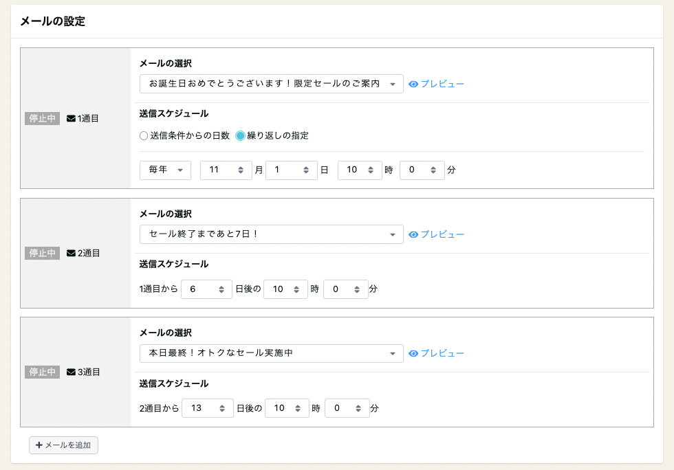 送信条件には、条件に一致した◯日後のほか、特定の年月日に対して繰り返しの設定も可能で、お誕生日のお祝いから始まるシナリオメールや、毎月の請求のご連絡など幅広い用途にお使いいただけます。