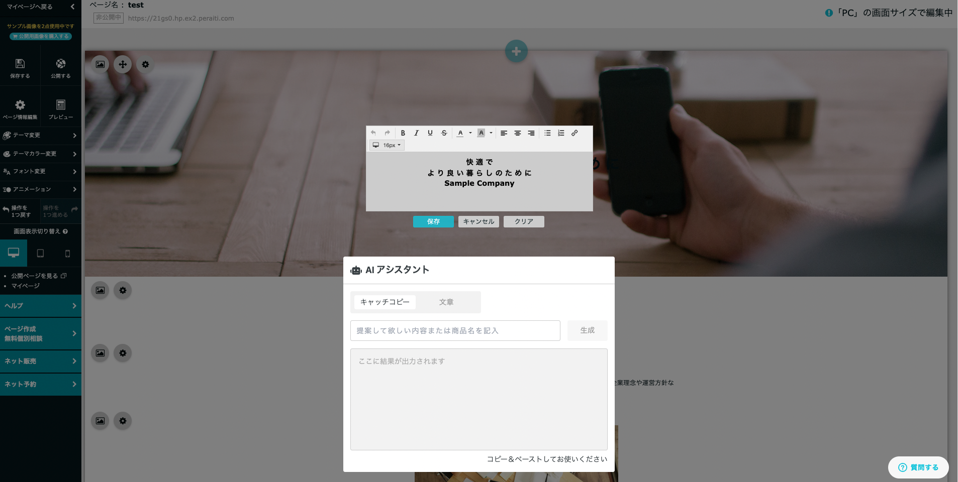ペライチでは、多くの方を悩ませている、ホームページ作成の際のキャッチコピーや文章づくりにおいて、AIアシスタントが作成の補助をする「AIアシスト機能」を2023年7月20日に提供開始しました。