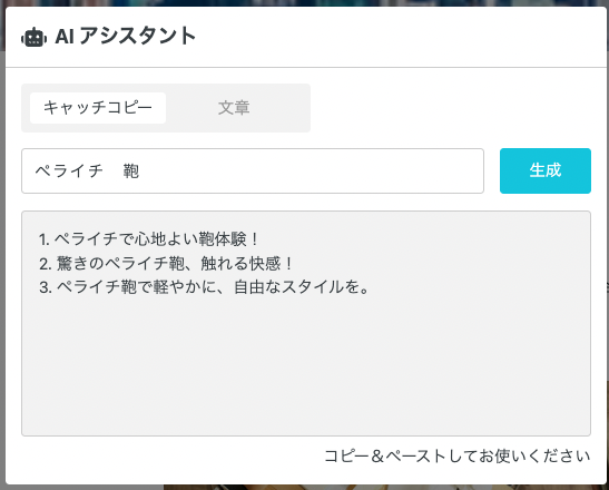 キャッチコピーの場合は、入力内容をもとに、3つの短文を生成。文章の場合は、入力内容を参考に、長文で説明文を生成します。
