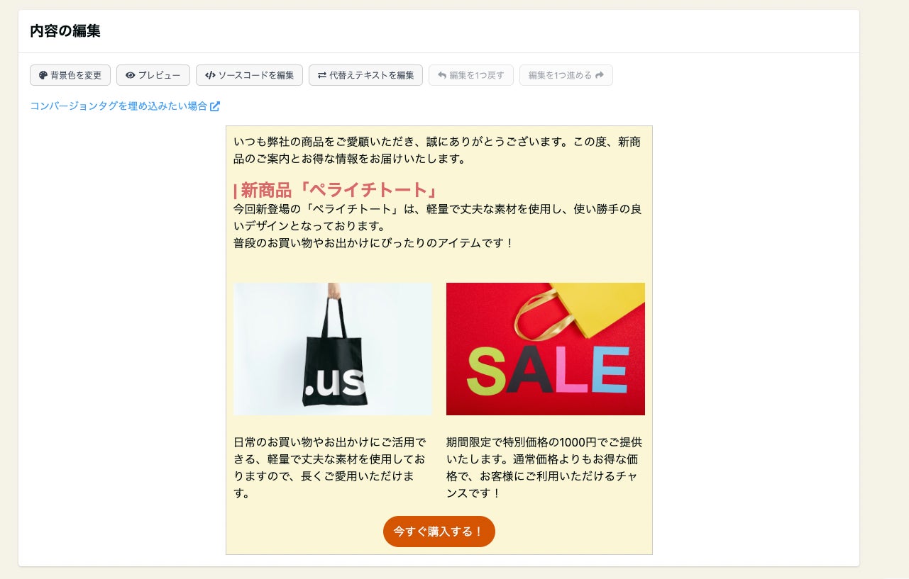 ボタンや画像の挿入がワンクリックででき、メールの背景や文字色も自由に設定することができます。