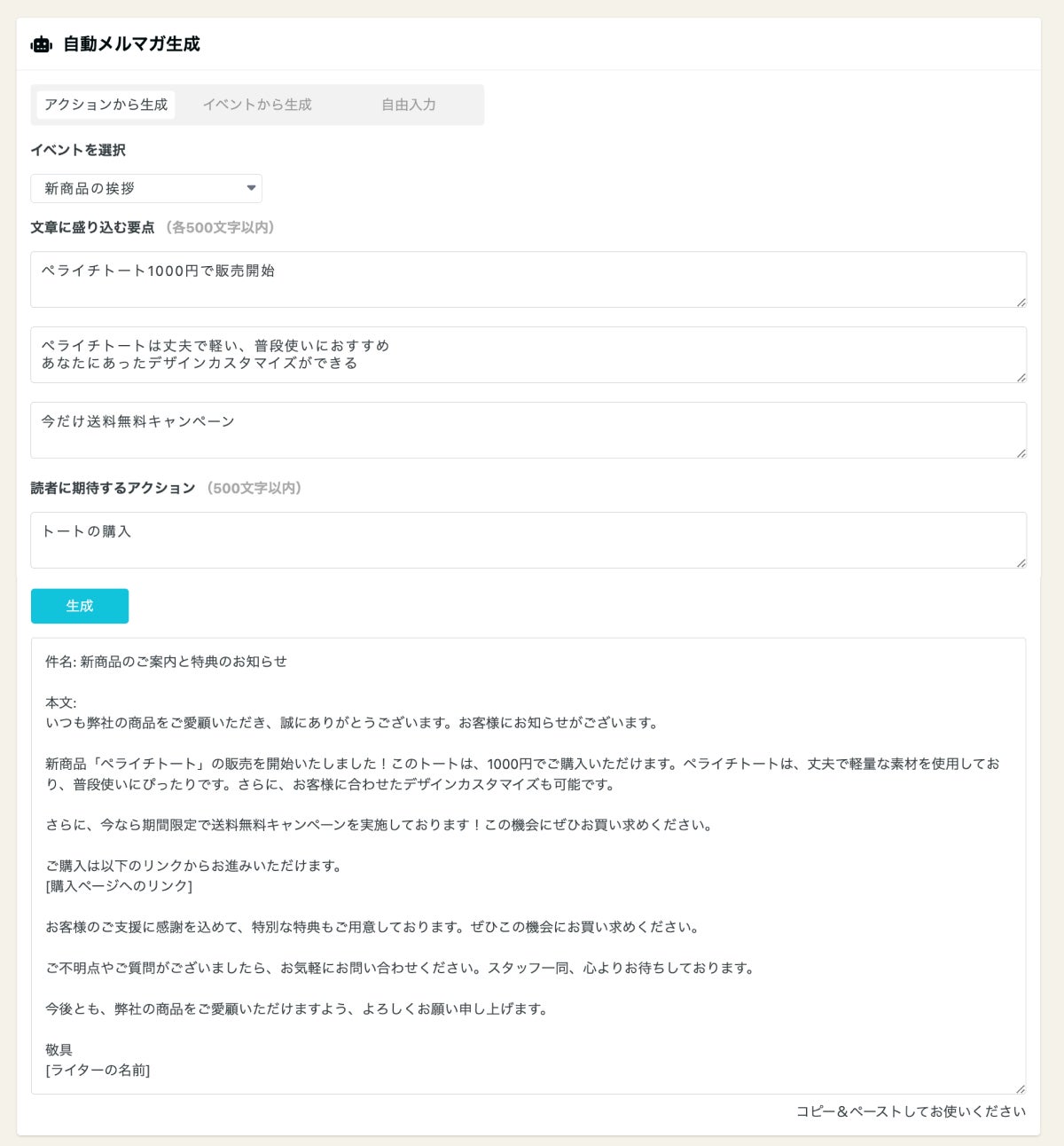 メルマガでの訴求軸として、読者に期待するアクションを入れての生成も可能です!