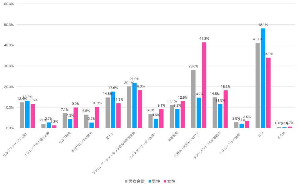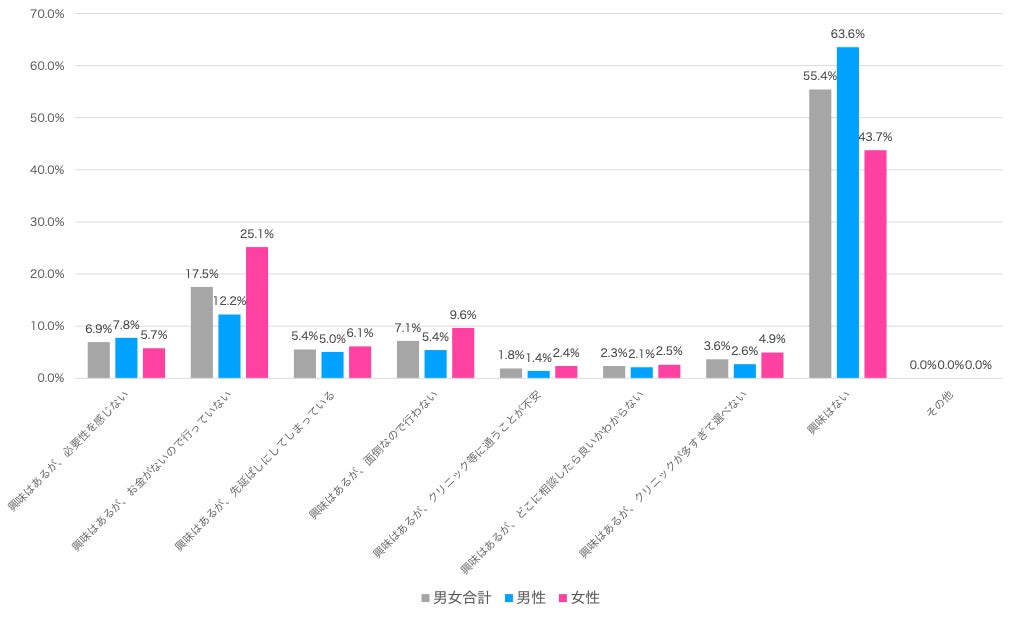 一方、特に女性において、「興味はあるが、お金がないので行っていない」が25.1%と1/4の方が、金銭的理由でボディメンテナンスを行っていないことがわかりました。また男性も、女性ほどではないものの12.2%の方が、「興味がある」もののボディメンテナンスを行っていない理由の中では金銭的理由が、最も高くなりました。