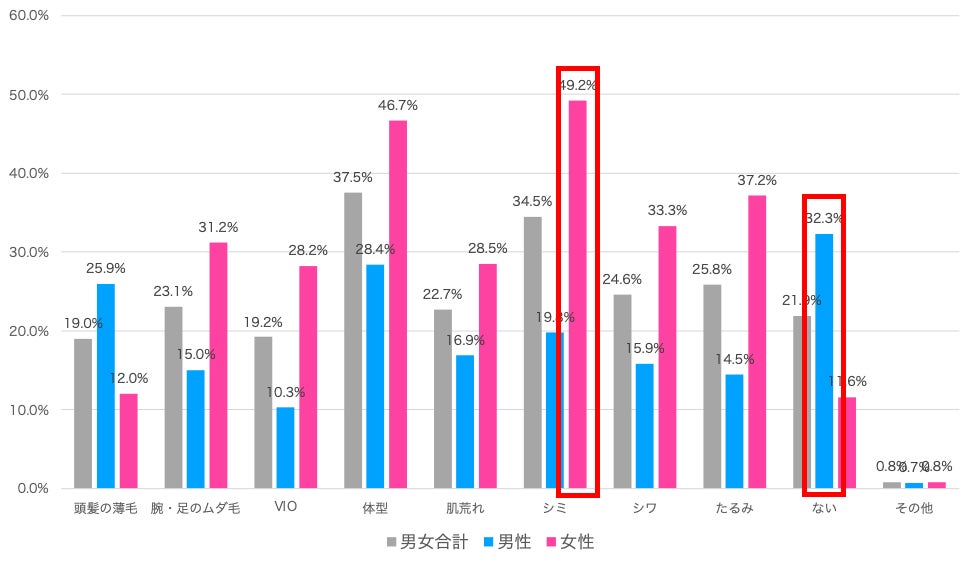 女性が一番気になっていることは「シミ」、男性はとくに「なし」