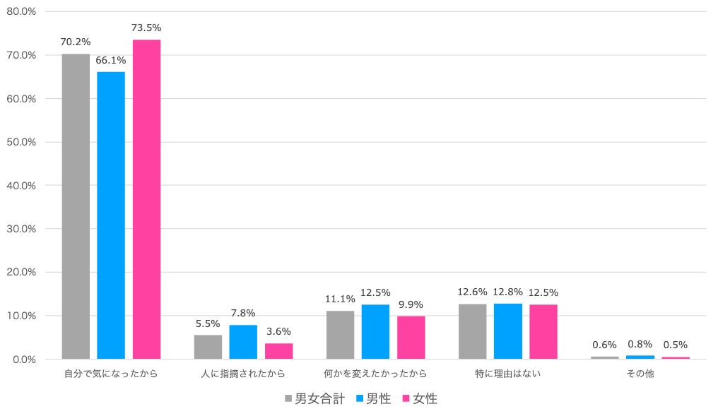 次に、前の質問でボディメンテナンスをおこなっていないと回答した方以外(何らかボディメンテナンスを行っている方)へ、ボディメンテナンスをはじめたきっかけについて伺ったところ、男女共に「自分で気になったから」が最も多く、約7割となりました。逆に、人に何か言われてボディメンテナンスをはじめた人は、5.5%とあまりいないことがわかりました。