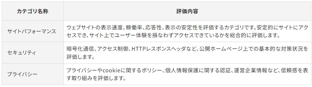 サイトリライアビリティランキングでは、サイトパフォーマンス、セキュリティ、プライバシーの3つのカテゴリで評価を行なっています。