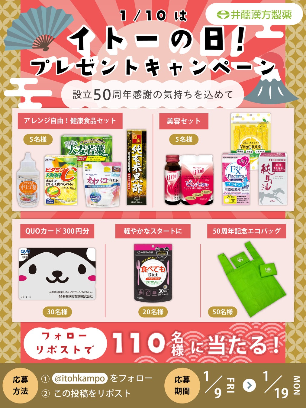 会社名の「井藤」にちなんだ1月10日の「イトーの日」を記念した本キャンペーンは、設立50周年という大きな節目を記念し、公式InstagramおよびXにて開催いたします 。日頃の感謝の気持ちを込め、両SNS合わせて計220名様へ健康や美容をサポートする豪華セットをお届けします。