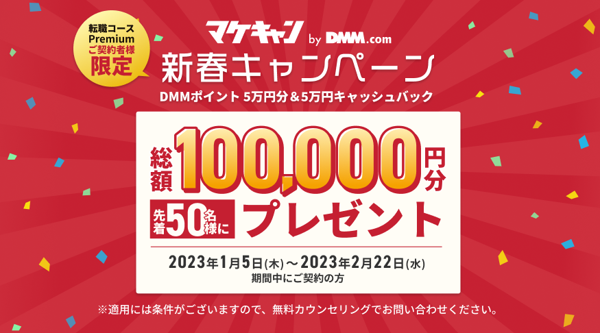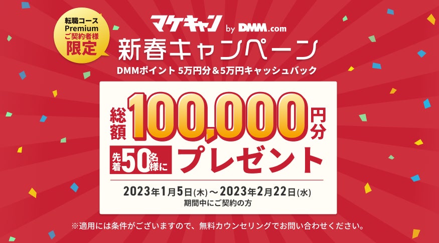 DMM.comグループの株式会社インフラトップ(本社:東京都港区、代表取締役 CEO:大島 礼頌 以下、当社)の転職保証付きWebマーケティングスクール「マケキャンbyDMM.com」(以下、マケキャン)は、対象期間中のご契約で総額10万円オフとなる「新春キャンペーン」を2023年1月5日より開催いたします。