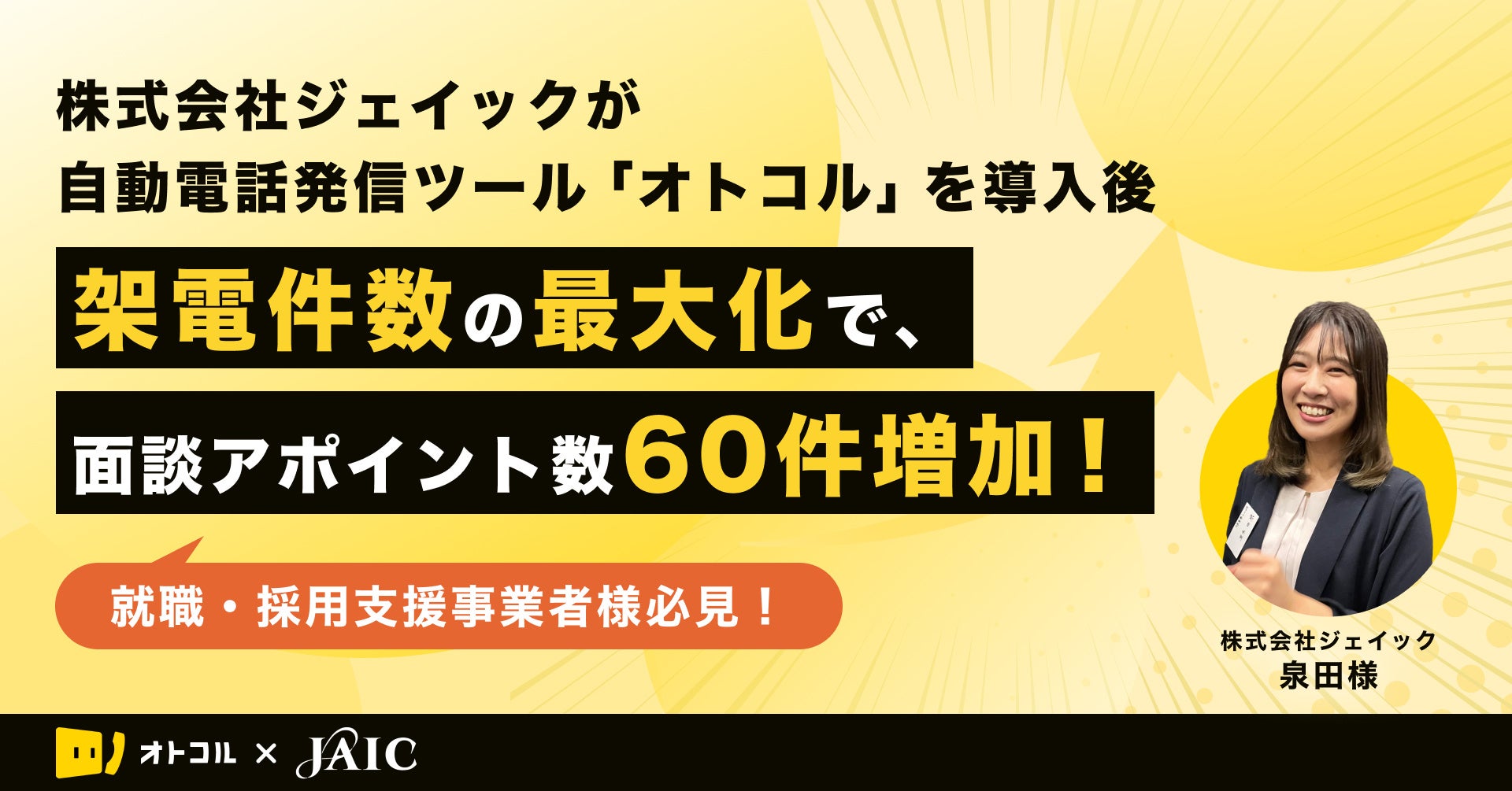 アイザック株式会社(本社:東京都渋谷区、代表取締役社長 田中 和希)は、企業向けの教育研修事業と若年層向けの就職支援事業を展開する株式会社ジェイック(本社:東京都千代田区、代表取締役 佐藤 剛志)に自動電話発信ツール「オトコル」を導入いただきました。休眠求職者の掘り起こしで架電件数を最大化し、業務効率の改善によって面談アポイント数の増加を叶えた好事例を公開いたします。