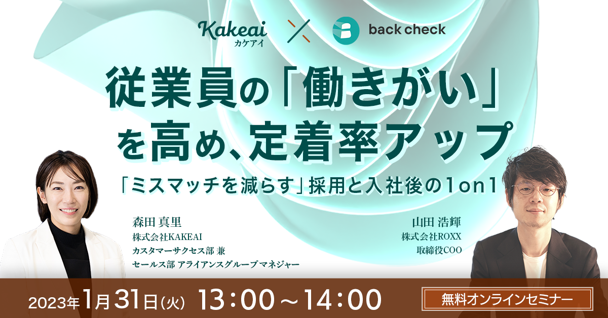 株式会社ROXX(本社:東京都新宿区、代表取締役:中嶋汰朗、以下ROXX)が開発・提供する、オンライン完結型リファレンスチェックサービス『back check』は、2023年1月31日、オンラインセミナー『従業員の「働きがい」を高め、定着率アップ「ミスマッチを減らす」採用と入社後の1on1』を開催いたします。株式会社KAKEAI カスタマーサクセス部 兼 セールス部 アライアンスグループ マネジャーの森田真里氏をお招きし、従業員の定着率向上のための採用フローと入社後のコミュニケーション手法を、ROXX 取締役COO 山田浩輝とともに講義形式でお伝えします。