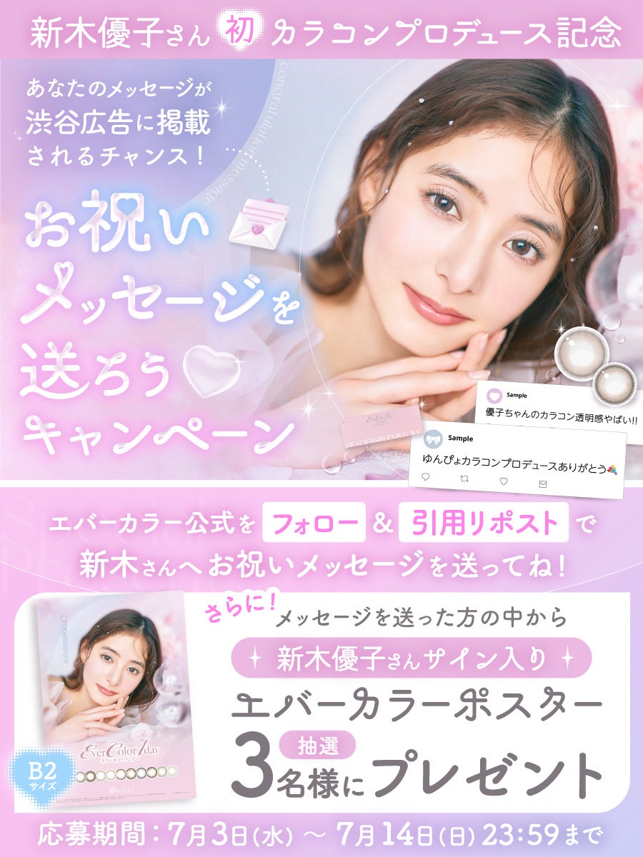 エバーカラー公式Xをフォロー&引用リポストで新木優子さんにお祝いメッセージを送ると、渋谷某所の広告にメッセージが掲載されるチャンスが獲得できるキャンペーンを開催。